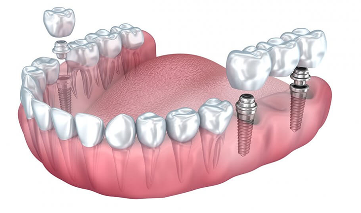 Dental bridge: The "bridge" is a dental prosthesis that leans on adjacent teeth to replace a missing tooth. The crowns of the bridge are connected to each other. A bridge requires the manufacture of at least 3 teeth whose central replaces the missing tooth.
